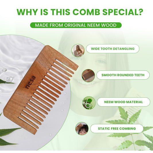 Nesa Neem Wood Shampoo Comb - Wide Tooth Comb for Hair Fall Control, Dandruff Relief & Post Shampoo Detangling | Eco-Friendly Comb for Thick, Long Hair | Natural Hair Care for Men & Women